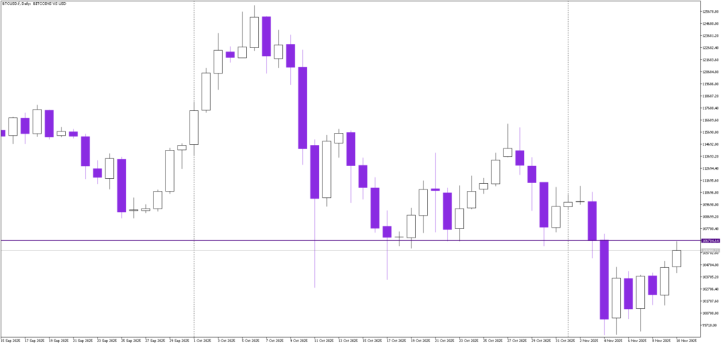 In today’s technical analysis, let’s focus on Bitcoin, which is trying to regain strength after recent weakness. The cryptocurrency is currently approaching a crucial horizontal resistance — an area around 106,700, marked with a purple horizontal line on the chart. This level served as a key support throughout October, but after a breakout to the downside in early November, it has now turned into a major resistance zone.