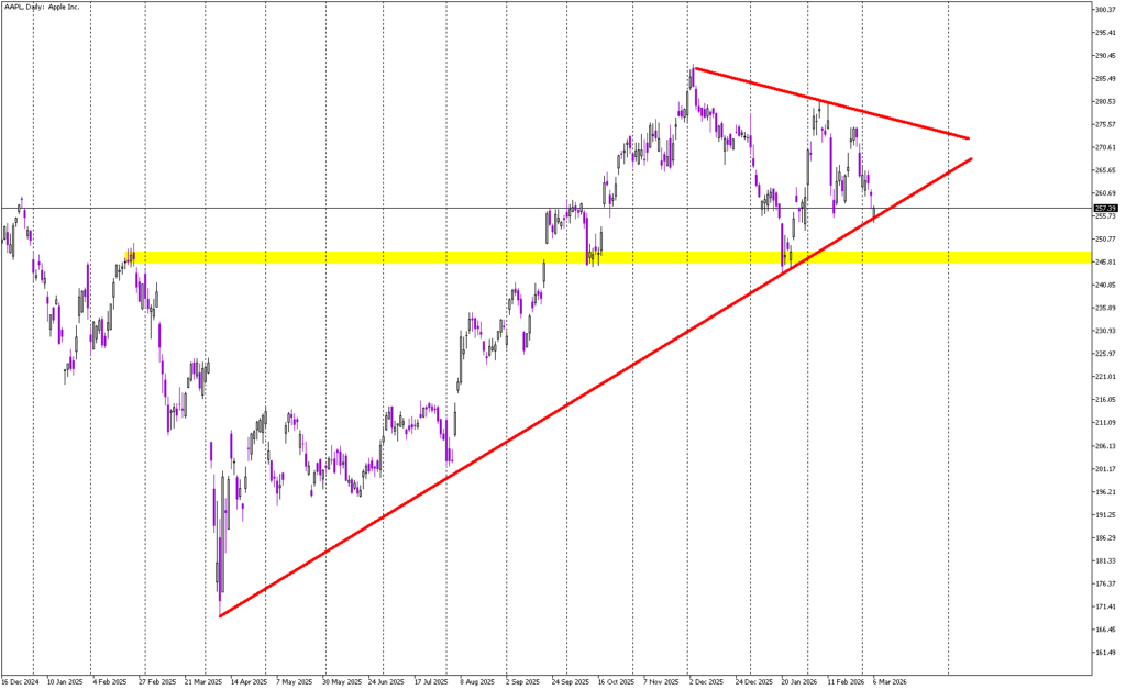 That level can be considered the last major stronghold for buyers. As long as Apple holds above the $247 support, the structure remains intact and the sentiment can still be interpreted as neutral to slightly positive.
